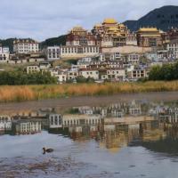 云南省迪庆藏族自治州香格里拉县建塘镇尼旺路噶丹松赞林寺18·8·17上午 铜瓦金镀,兽吻榭飞檐。宗教文化荟萃篇。鲜艳彩、藏传佛教虔诚,圣地临,华美神秘庄严。 立体轮廓绣,金鹜嬉声,湖面恢弘依青山。云天笑如何,玉池瑶影,凌波唤、琳琅频传。溢却秋风层层递来,细腻问流年,艺术欢敛! 戊戌年七月廿六