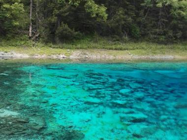 五花海位于九寨沟三条沟的日则沟中段,孔雀河上游,由于海底的钙华沉积、各种色泽艳丽的藻类以及岸边五彩斑斓的林木倒影,使...