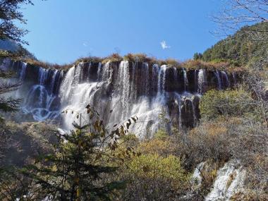 诺日朗瀑布位于诺日朗游客中心附近,是中国大型钙化瀑布之一。瀑布宽270米,高24.5米,也是中国最宽的瀑布,众多的影...