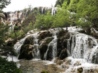 珍珠滩瀑布,是九寨沟最大的钙华瀑布,来自山中融化的雪水,从21米的高处冲进谷底,吼声如雷,卷起千堆浪花,这道激流水色...