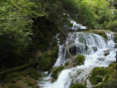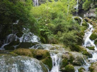 熊猫海瀑布高度达80米,是沟内瀑布中落差最大的一个,三级叠水,极为壮观。水流奔腾而下,在栈道边激起水花,跌落深谷的激...