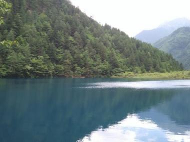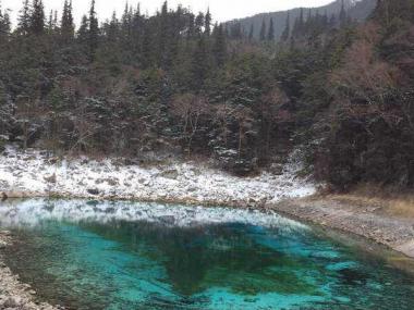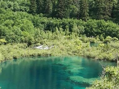 卧龙海非常小,因为海子底部有一条钙化带,看似卧龙,因而得名。在高处看去,就像一块碧蓝的宝石。卧龙海四周长满了花草树木...