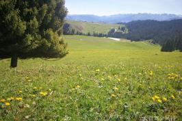 江布拉克是哈萨克语,意为“圣水之源”,景区由自然景观、水域风光、生物景观三种资源类型组成,雪山冰川、高山和亚高山草甸、中山森林、低山草原景观别具特色。在江布拉克草原主要是观看漂亮的自然风光,这里有雪山围绕的草原、景色优美的木制栈道观景路线,还有开阔的田野等,一派田园牧歌的景观。每到六七月份,草原上野花遍地,更是拍照摄影的好时机。