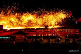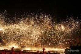 司徒小镇的千余人打铁花团队,是中国历史上的首次打铁花豪华阵容。夜幕降临时,千人赤膊上阵同时打铁花,炉火正旺、铁水火红,汗水混合着铁水,朵朵铁花如天女散花,绚丽夺目,夜空之下,火星璀璨,犹如天女散花。