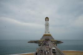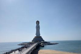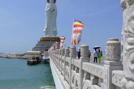 南山海上观音是座108米高的观音菩萨圣像,位于南山寺前的海上金刚洲(观音岛)上,其圣象为正观音的一体化三尊造型,脚踏一百零八瓣莲花宝座,宝相庄严雄伟。海上观音是三亚著名的佛教建筑,也是著名的祈福胜地。海上观音的莲花座下为金刚台,金刚台内是面积达15000平方米的圆通宝殿。
