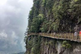 青云栈道在明月山山顶,是欣赏明月山风景的独特位置,拥有“绝壁览胜”一大景观,位于海拔1700米处,全长3100米左右,常年云雾缭绕,行走其上,有平步青云之感。悬空的栈道横亘于悬崖峭壁上,如盘云的游龙。崖壁上,迎客松及各类灌木点缀左右,形态万千,是最受游客喜爱的景致。