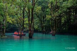 水上森林是荔波小七孔的一个著名景观,是属于罕见的岩溶地貌水上森林区。这里的千百株树木,包括珍奇树木数十种,全都植根于水中的顽石上,又透过顽石扎根于河床,造就了这幅水中有石,石上有树,树植水中,水、石、树相偎相依的奇景。