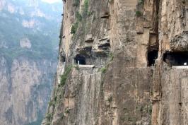 回龙壁挂公路地处河南省新乡市辉县回龙村。回龙村民以前走的是挂在绝壁上的“沿猴梯”,稍有疏忽就会摔下深渊。1997年,全国劳动模范、全国优秀共产党员、回龙村党支部书记张荣锁率村民在峭壁上开出一条8公里长的挂壁公路。让人惊叹的是,隧洞在山腹里转了个“S”形,千多米长,刚好爬到山另一面的岭脊上。