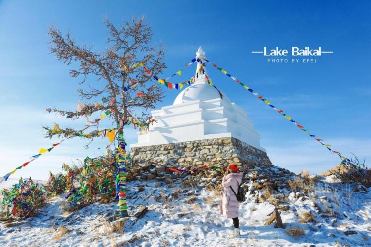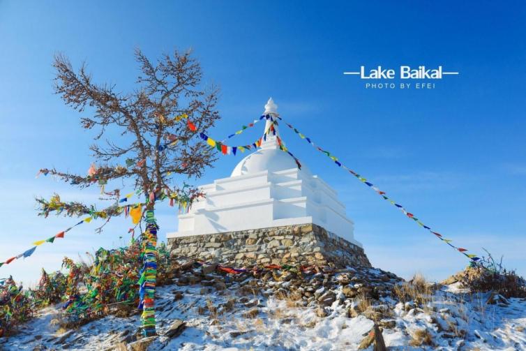 在贝加尔湖畔,有这样一座白塔,供当地人祭祀祈福。白塔在湖畔的小山丘之顶,通体白色,周围系满了经幡,就连边上的小树身上也都绑满了经幡。 经幡承载着人们对美好生活和美好愿望的憧憬,同时也给贝加尔湖畔这座通体透白的白塔增添了一份美丽,让旅行至此的我们也不想要如当地人一般祈福一番。 经幡迎风摇曳,白塔折射着冬日阳光,却不耀眼,依然洁白而美丽。 白塔周围和上山的道路上,许多树枝上常常能见到人们手工织的毛线花儿,十分漂亮。也如同经幡一般装饰点缀着这片冬日的彻白,人们对生活的用心,对自己所住之地的热爱,让我越发爱上了这里。 从山坡向下眺望,很难想象夏天时一汪湖水,在冬天竟是一片雪白。 向往与此地的生活,这一番美妙景色让我爱极了这里,就像身临神迹之地不愿离去,若是有暇,一定要在贝尔加湖畔的冬日过上一阵子!