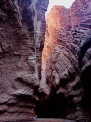 库车大峡谷,大峡谷近似呈南北弧形走向,开口处稍弯向东南,末端微向东北弯曲,由主谷和七条支谷组成,全长5000多米,谷端至谷口处自然落差200米以上,谷底最宽53米,最窄处0.4米,仅容一人低头弯躯侧身通过。谷侧奇峰嶙峋,争相崛起;峰峦叠嶂,劈地摩天,崖奇石峭,磅礴神奇;神洞秘窟,各蕴其意。谷内蜿蜒曲折,峰回路转;步步有景,举目成趣;泉水叮咚,鸟叫蝉鸣,寒暑不浸,游人称绝。整个峡谷犹如一条尾震天山头,口饮库河流(开口于库车河),曲身九十九的巨龙劈山而卧,呼风唤雨,神秘莫测。更令人称奇的是,距谷口1400米深处,高约35米的崖壁上,有一始建于盛唐时期,壁画丹青的千佛洞遗址,就文字记载和绘画艺术而言