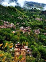 甲居藏寨的一栋栋藏居从大金河谷开始层层叠叠向上攀援,星罗棋布,一直伸延到卡帕玛群峰脚下,就像珍珠落在翡翠般的大山上。云雾蒸腾,炊烟袅袅,宛若童话世界,名副其实中国最美的乡村。