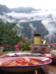 丹巴甲居藏寨值得一看,不过现在那里的商业味道太浓了,都成旅店了。离此两小时车程的山的另一边还有一个中路乡藏寨也很美,但是车路不好走,因此主要是摄影人去那边,游客不多。我们在甲居藏寨游完后去中路藏寨,住在那里的一家好想叫东坡藏家的客栈,100元包住还管早晚餐,感觉不错。他们的菜烧的挺好,我们三个人仍然上了7个菜。还有,他们那里本地苹果味道很好,就是品相不好看,不妨尝一尝,客栈里自产的苹果随便吃。