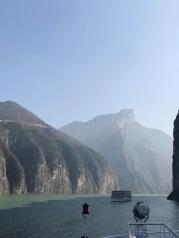 早上登船继续上行游览瞿塘峡(长度最短、最险峻),通过峡口“夔门”(天下雄)景点,只见两边高大垂直的山体岩壁临江夹峙,犹如一道大闸门立于江面,的确非常挺拔雄伟。