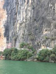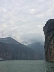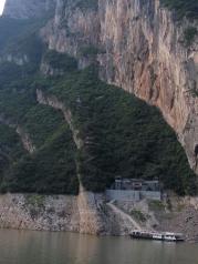 瞿塘峡,三峡的第二个峡谷,由于是枯水季节,江面上有一节裸露的岩石。两边的山峰高低错落有致,非常的险峻。这么陡峭的山峰,还有建筑,不得不佩服人类的伟大。