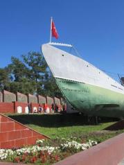 海参崴C-56潜艇博物馆是为纪念英勇牺牲的潜艇官 兵,战后C-56潜艇被分割成数段,用火车、汽车、起重机运送至此,组合焊接复原,建立了这个别致的实体博物馆。