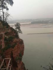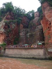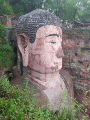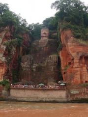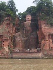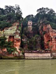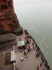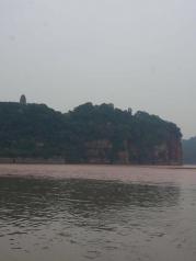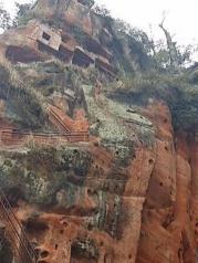 乐山七十一米高的大佛非常值得一看,要观看大佛有两种方式,一是坐船远眺全貌(其实也不是很远,也是能看清楚的,没那么辛苦。)二是靠体力爬下爬上,因为要站在大佛前面看要先爬下小楼梯(请看图三左侧),听说有二十层楼高的楼梯,观看完后还要再从另一边爬上去,这样一上一下时间费得也多。