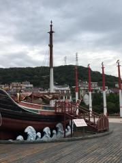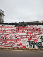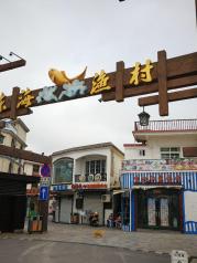 下午开车去和尚套景区,路过这个东海渔村,看着还不错,附近又有停车场,就停下来看看。 村口有木制牌坊,两边是两幅巨大的渔民画,红白黑三色,挺醒目的。 这里有个挺大的沙滩,是嵊泗为数不多尚未圈地收钱的沙滩。不远处停了好多小船,船上的红旗迎着海风飘飘,画面挺美,就是缺了点蓝天。 渔村里面有很多大排档、客栈民宿,淡季没啥人气。